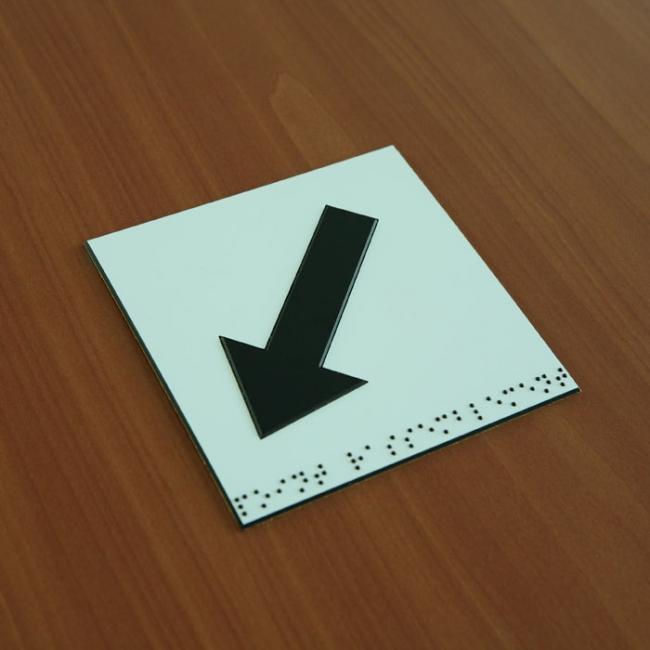 - composé d'un pictogramme en relief et d'une ligne de braille en billes acryliques noires